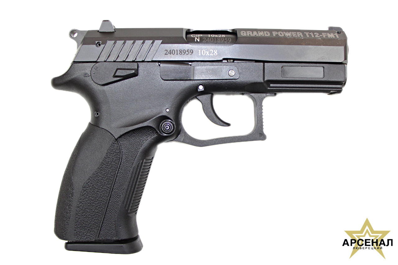 Пистолет (ОООП) Grand Power T12-FM1 калибр 10х28 производство Фортуна (Нижний Новгород, Россия). Grand Power T12-FM1 является доработанной версией пистолета Т-12Ф. Автоматика пистолета T12-FM1 осуществляется за счет хода свободного затвора. Для удобства устаноки дополнительных аксессуаров на пистолете имеется планка Пикатини. Из особенностей Гранд Пауэр T12-FM1 , можно подчеркнуть, удобство эксплуатации как для левши, так и для правши.